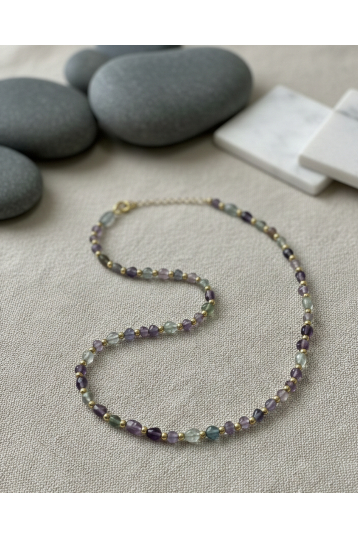 Doğal Florit taşının yeşil, mor ve mavi tonlarının uyumuyla hazırlanan bu kolye, sade ama dikkat çekici bir şıklık sunar.; Oval form florit taşları ve altın renkli ara aparatları sayesinde zarif ve dengeli bir görünüm elde edilmiştir.; Minimal tasarımı sayesinde günlük kullanım için ideal olduğu gibi, katmanlı kolye kombinlerinde de şık bir tamamlayıcıdır.; 🔍 Ürün Özellikleri Ürün Tipi: Kolye Taş Türü: Florit Kesim / Form: Oval / Doğal Form Malzeme: Doğal Taş Ara Aparat: Altın Renk Metal Üretim: El Yapımı Renk: Yeşil – Mor – Mavi Tonları Kapanış: Klips + Uzatma Zinciri Kullanım: Günlük / Özel Gün Cinsiyet: Kadın Paket İçeriği: 1 Adet Kolye 🎁 Not Doğal taş olduğu için renk tonları ve dizilimde küçük farklılıklar olabilir Hafif yapılıdır, boyunda rahat kullanım sağlar Hediye olarak uygundur
